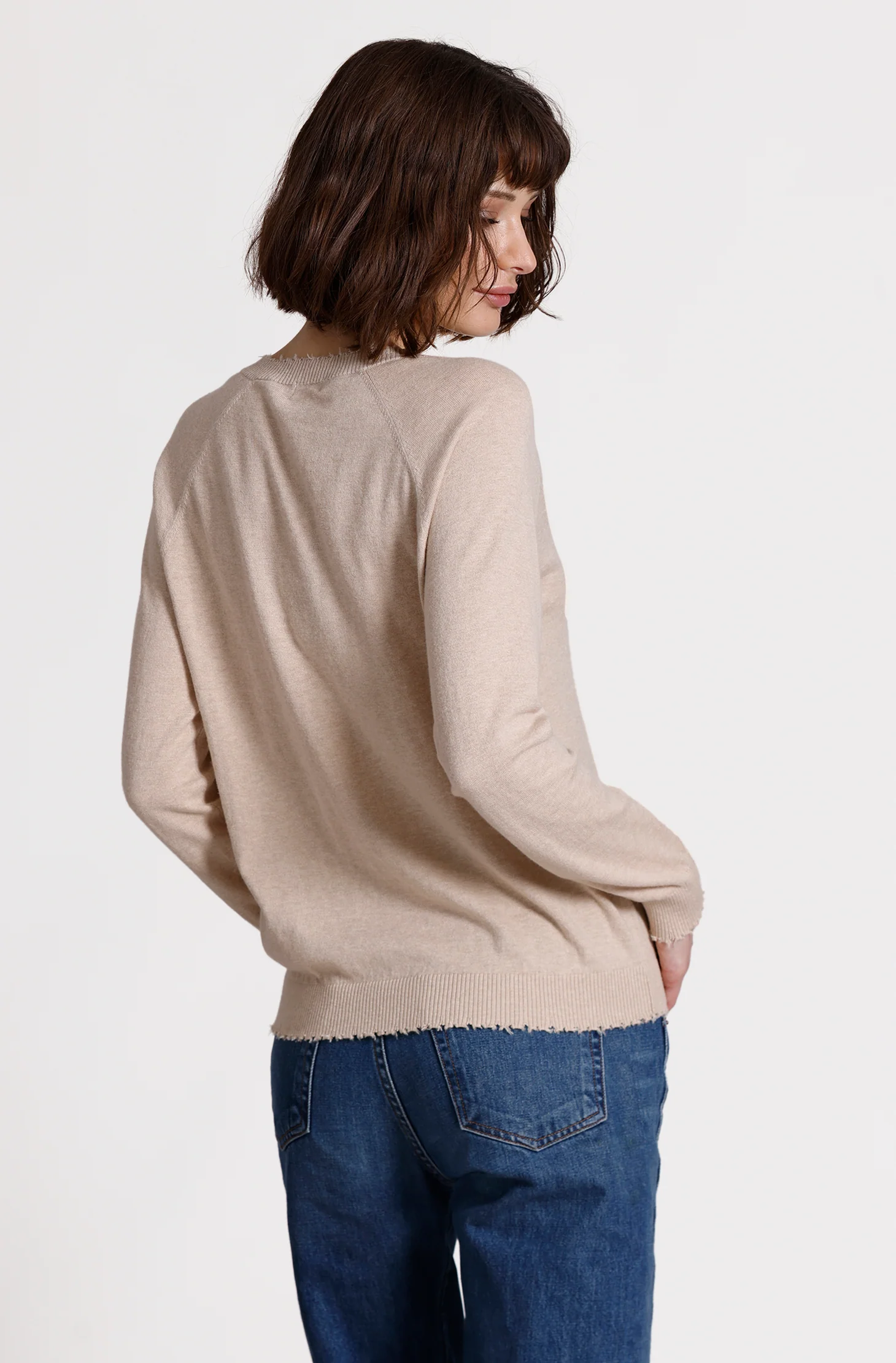 The Cotton Cashmere Frayed Edge V is your new favorite flirt. Spun from a seductive blend of cotton and cashmere, it melts onto your skin with a barely-there feel and a touch-me texture. The deep V neckline dares to plunge—revealing just enough—while raw, frayed edges add that undone, lived-in allure.